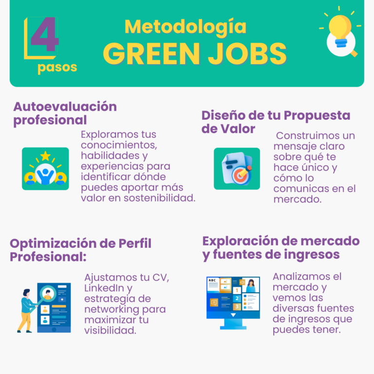 - Plan de acción a medida: Diseña una estrategia concreta para buscar empleo o crear nuevas oportunidades en sostenibilidad.